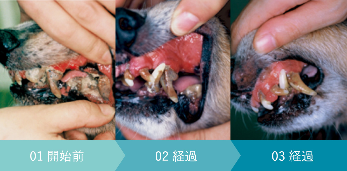 その後、口臭の解消を維持しつつ、第150日病日にかなりの歯石菲薄化。第400日病日には、歯石の一層な菲薄化と灰白色様変化を認める。」