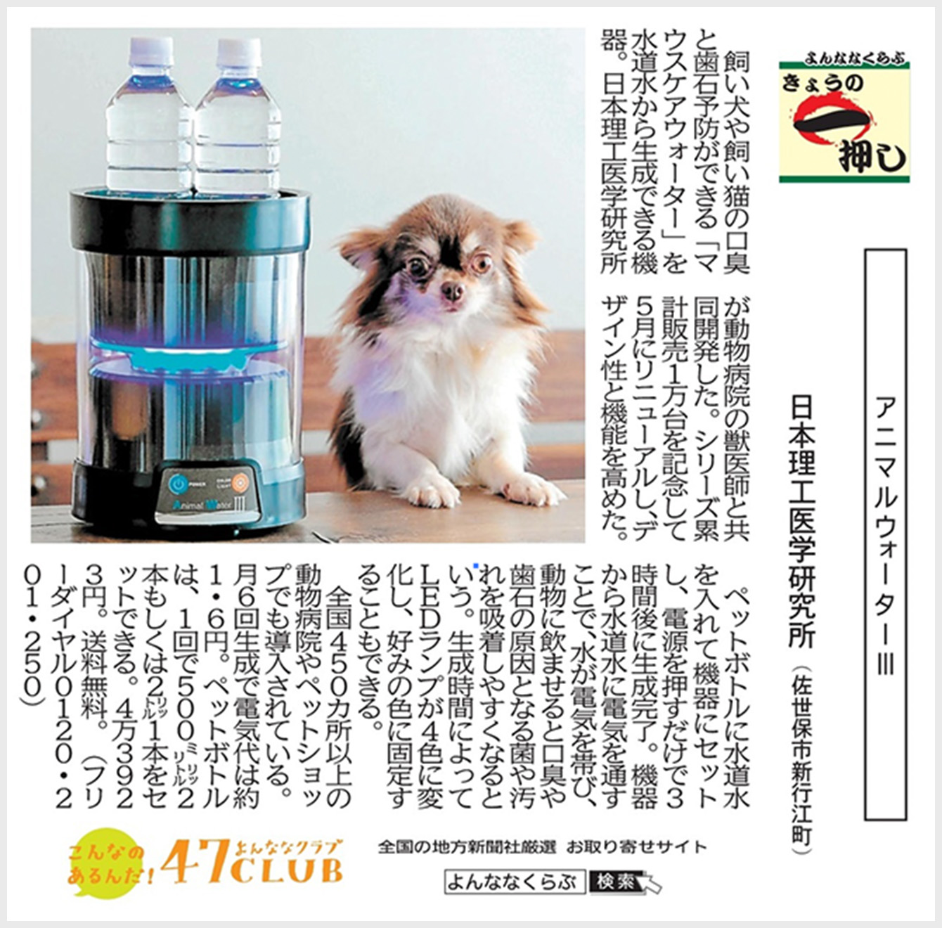 ペットは個体差が大きく、体内に入れる安全性を実証するために臨床や試作を幾度となく重ねました。多くの獣医師から指導を仰ぎながら、13年の歳月を経て、電気の力で水の洗浄力を高め口の汚れを落としやすくする動物用飲用水生成器【伝医水】、【アニマルウォーター®】を商品化しました。