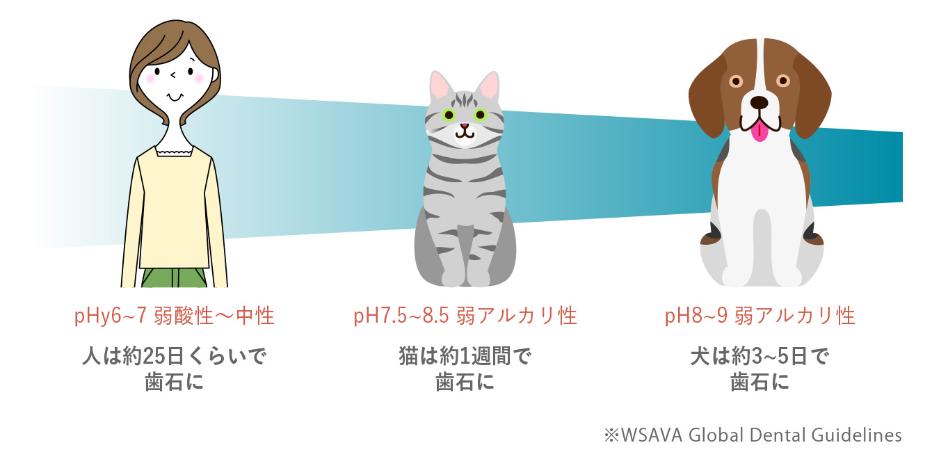 人間は歯石ができるまでに1ヶ月ほどかかるが、ワンちゃんは約3〜5日、ネコちゃんは約1週間!